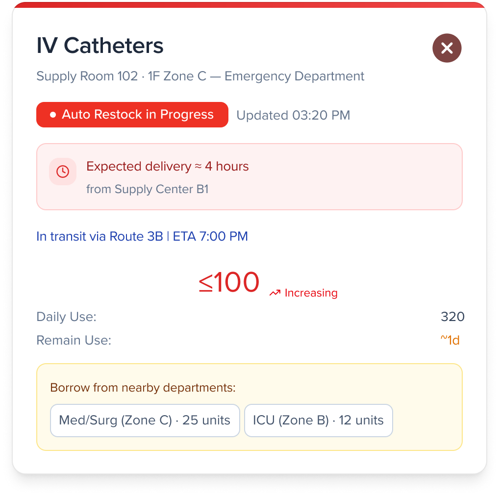 Inconsistent wayfinding and inefficient, manually tracked supply retrieval force nurses to walk around, wait, or fetch items themselves—creating avoidable delays and workflow interruptions.